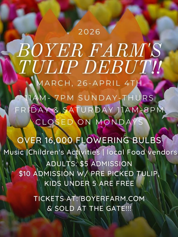 Contact us to order your tickets for family fun activities at Boyer Farm, a local farm with a pastured garden. Stay updated on our grand opening events, including the highly anticipated tulip festival and our exciting you-pick options.